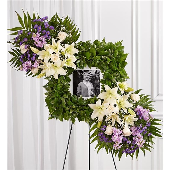 Celebrate the cherished memories you shared with a beautiful floral arrangement. Our unique design features a square wreath of greenery—perfect for displaying a photo—and two sprays on each end gathered with soothing lavender & white blooms for a lush, full presentation. It’s a special tribute to honor the life of a loved one. Standing spray arrangement features a stylized 18" square wreath with assorted greenery covering the base and two floral sprays at opposite ends gathered with white roses and Asiatic lilies, lavender stock, purple monte casino; accented with baby’s breath and soft, lush greenery Measures approximately 38"H x 40"W without stand Arrives on an easel; measures 66"H Appropriate for the funeral home or gravesite Our florists hand-design each arrangement, so colors and varieties may vary due to local availability To ensure lasting beauty, Asiatic lilies may arrive in bud form and will fully bloom over the next few days